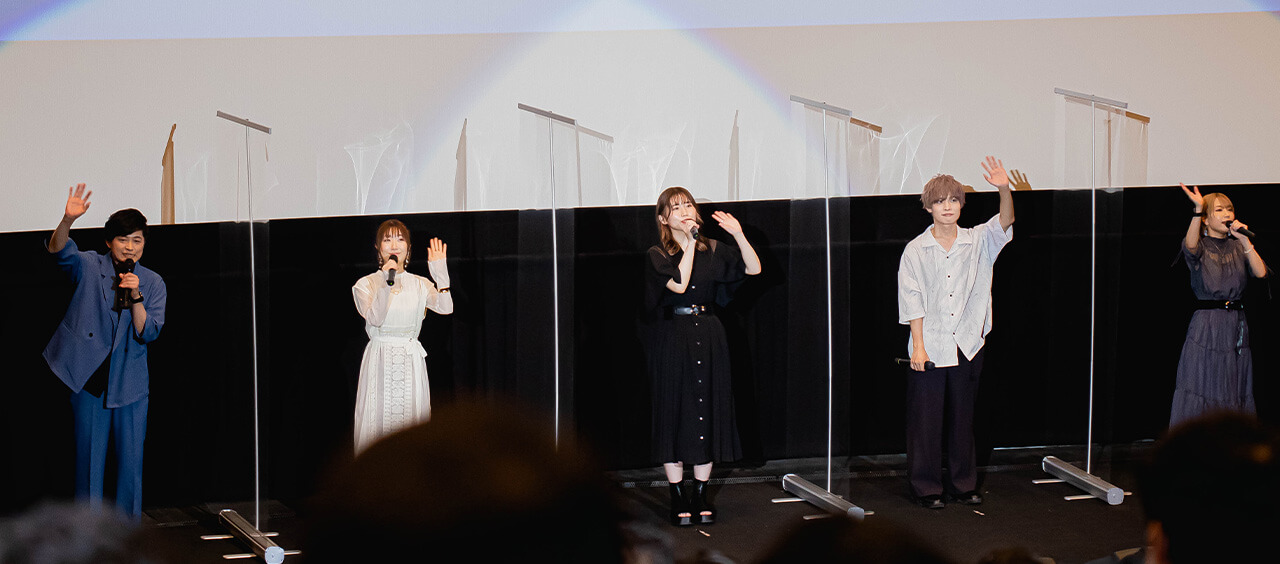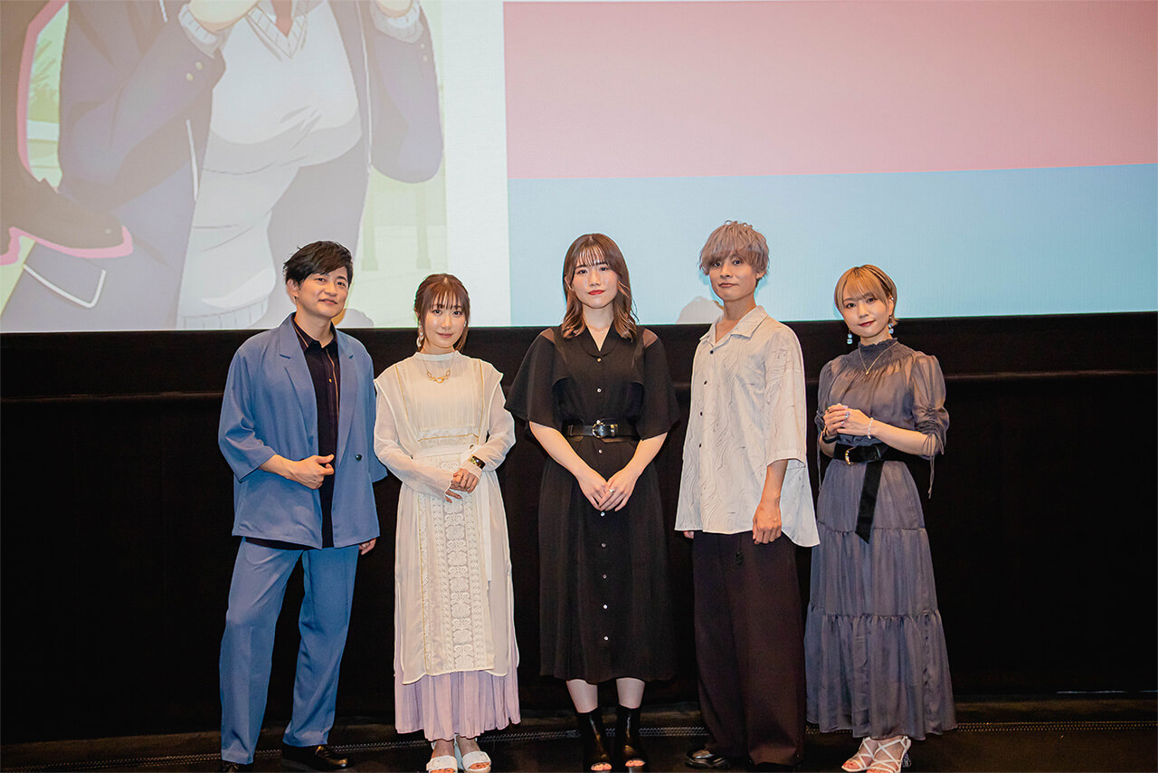 新PV公開と放送情報、ラジオ情報などの告知のあとは、来場者のみに向けたネタバレありのトークへ。第1話に関しては、下野さんが「朗読劇のよう」、日高さんが「モノローグとセリフ、ナレーションの切り替えが難しかった」とアフレコの感想を語り、第2話は下野さんが「思春期にああだったらよかったよな」と語るなど、青春感たっぷりのエピソードにキャストも大盛り上がりだった。